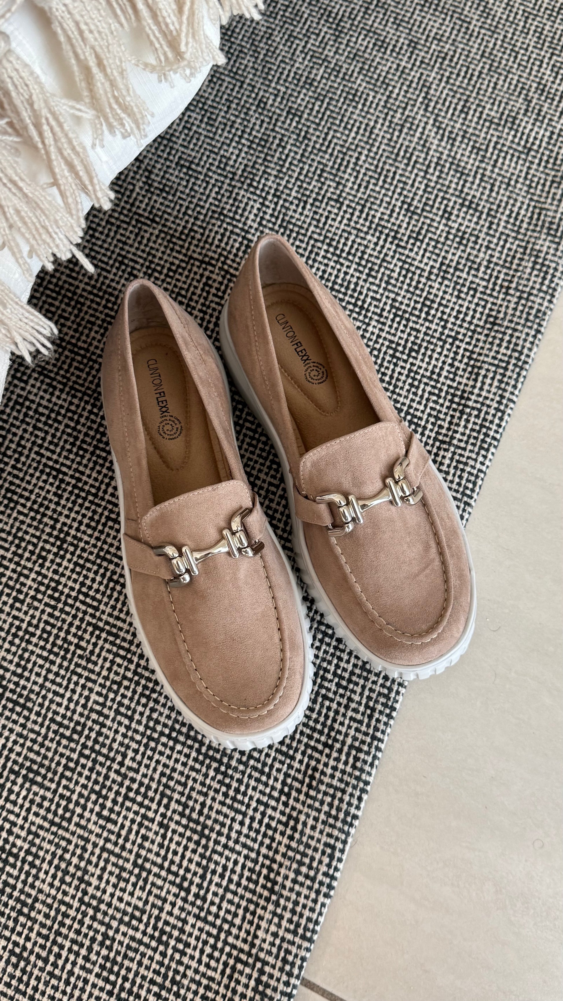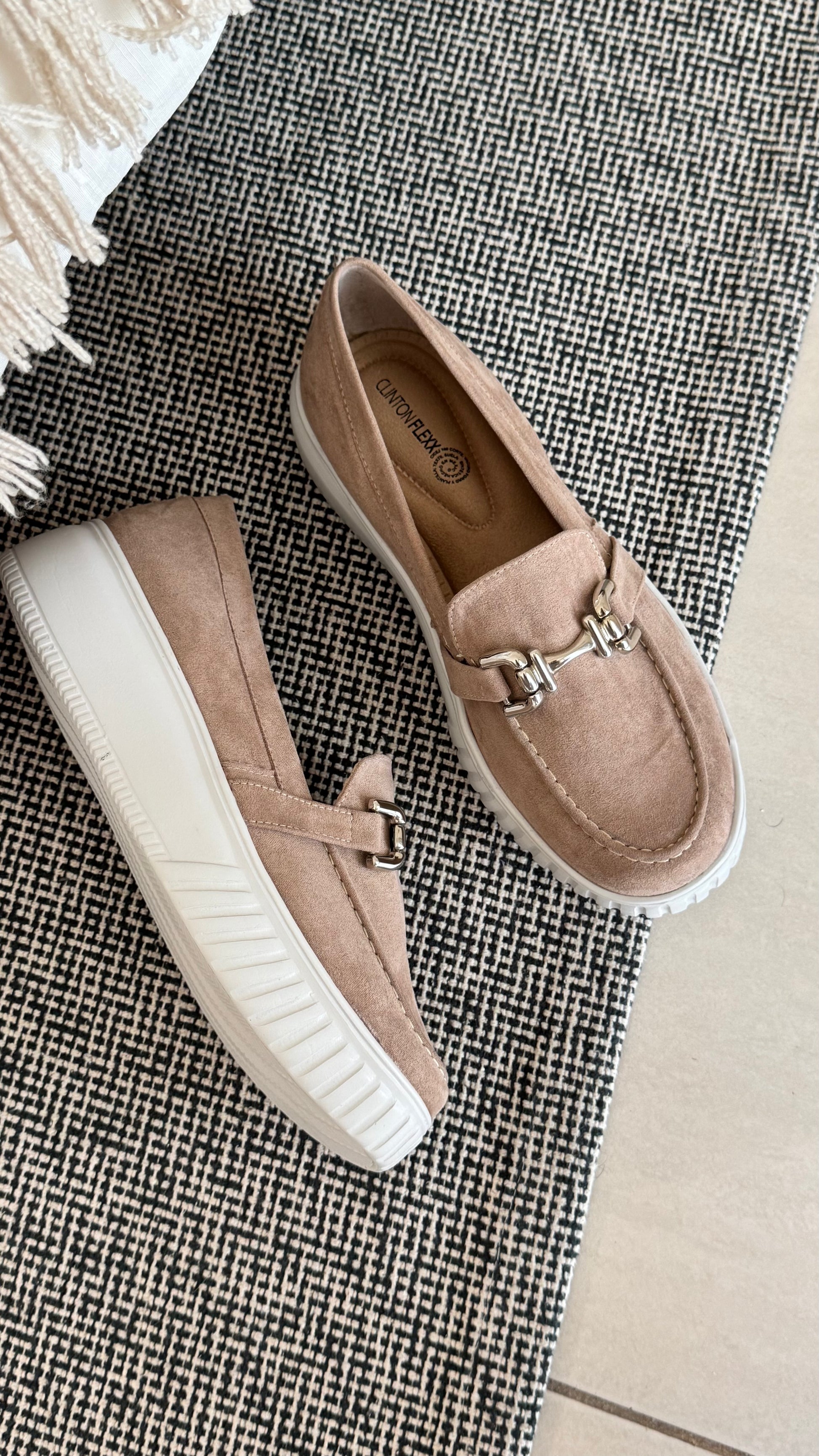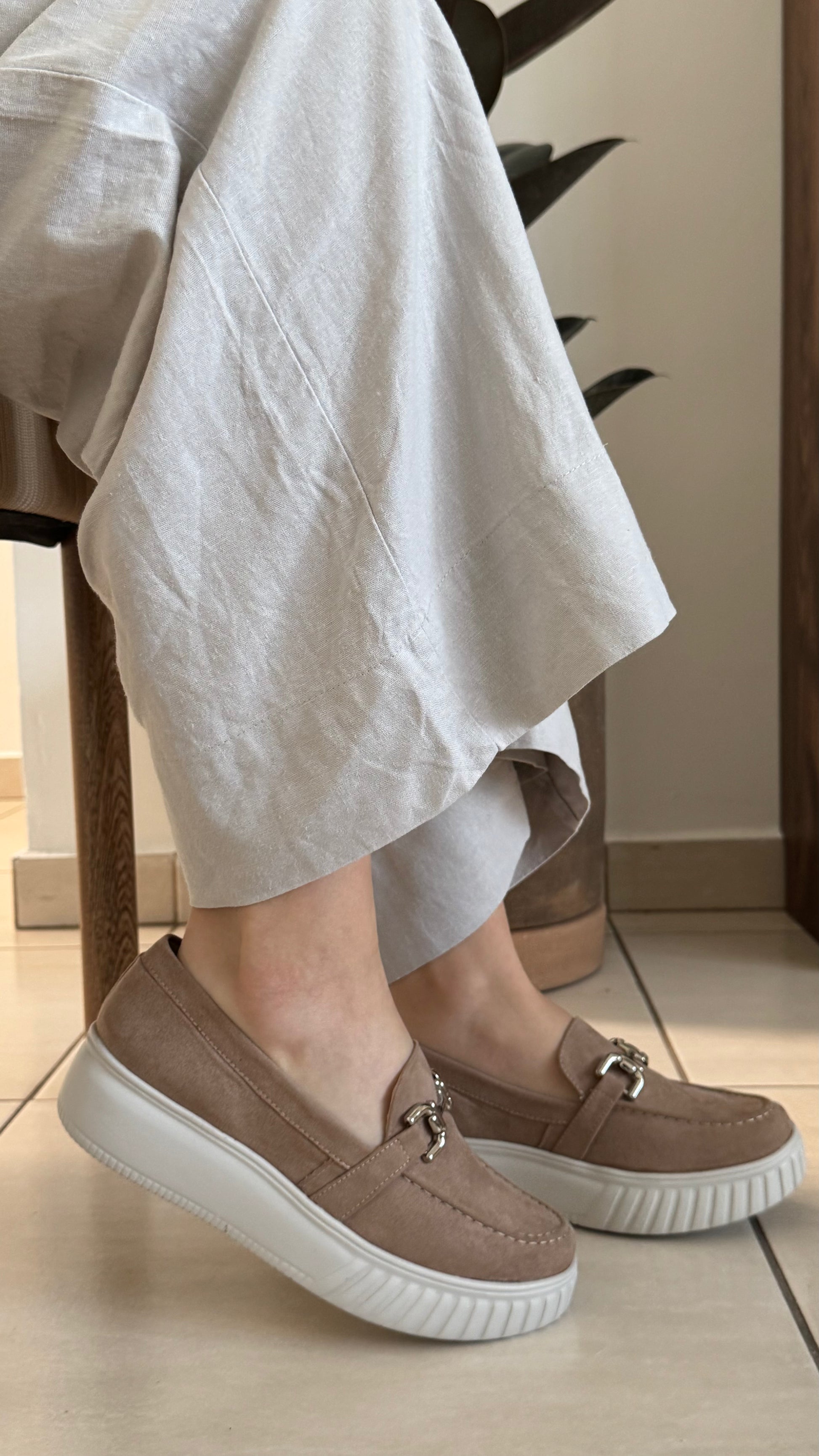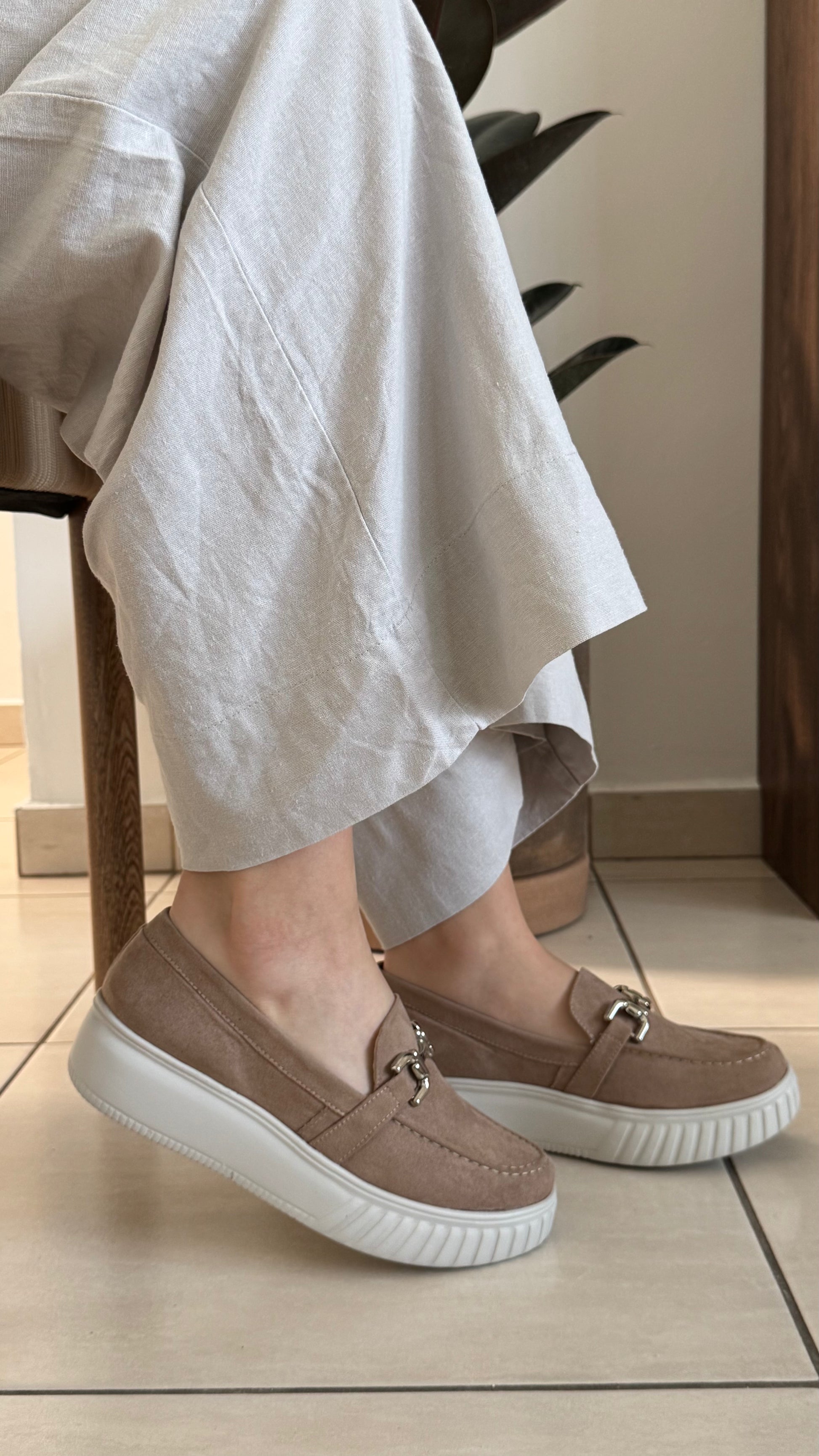 TENIS COLOR MAQUILLAJE, MATERIAL DURAZNO SINTÉTICO, SUELA BLANCA DE 3 CM. HORMA NORMAL.